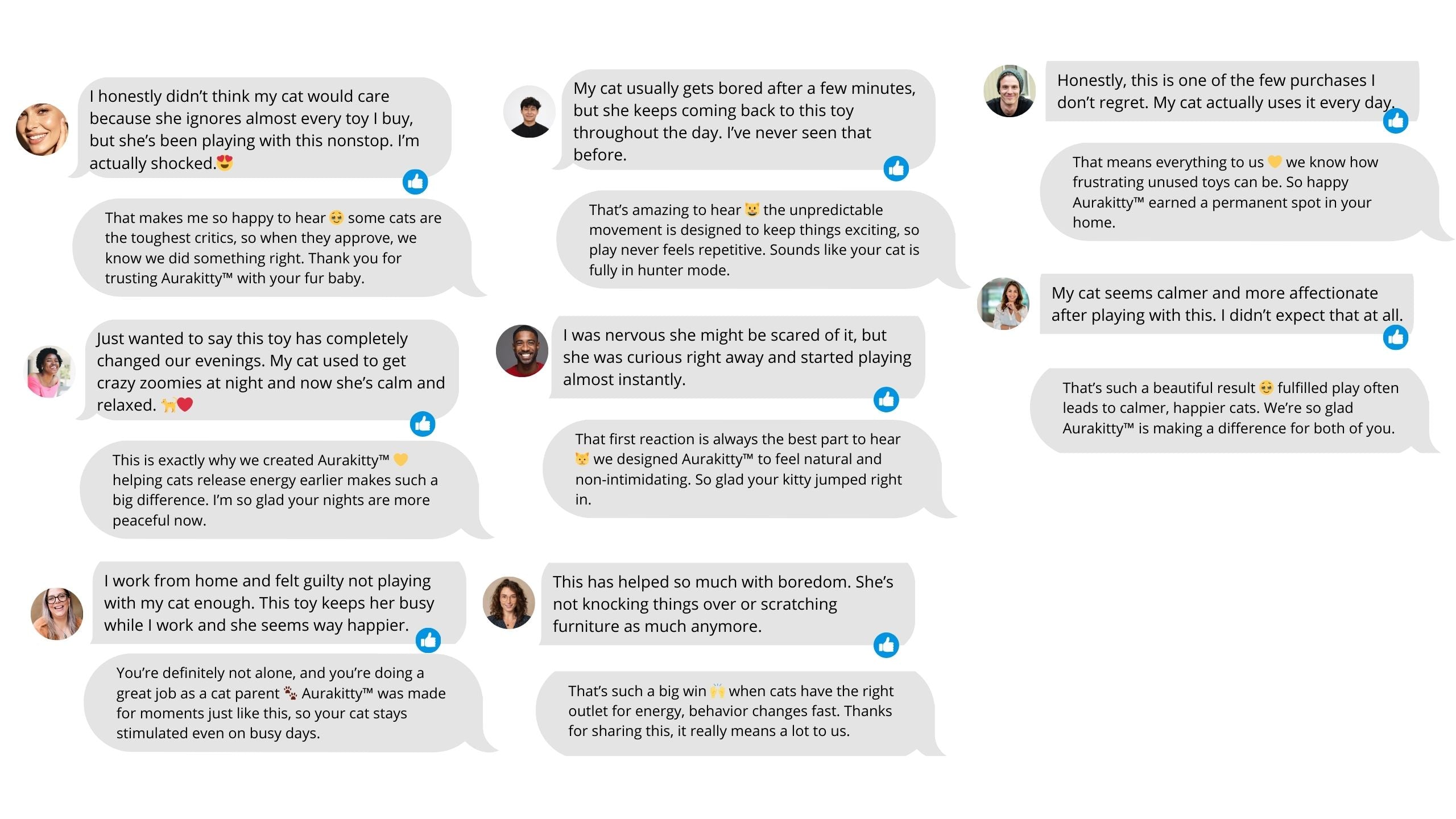 Aurakitty™ isn’t just fun to watch, it creates noticeable improvements in your cat’s behavior and daily routine. By activating natural hunting instincts, it helps indoor cats release energy in a healthy way, leading to calmer behavior and a happier home.
